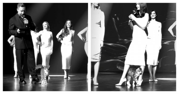 Кошка поднялась на сцену во время конкурса красоты и прошлась между участницами. Сама грациозность!