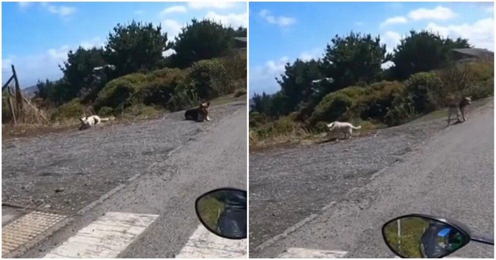 Мотоциклист перехитрил бродячих собак, гоняющихся за участниками дорожного движения.