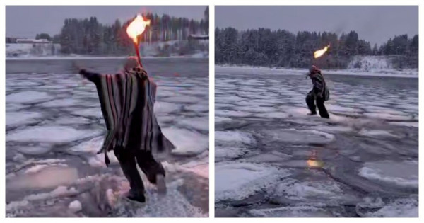 Мужчина устроил себе пробежку по льдинам на водоёме. В следующий раз может так не повезти.