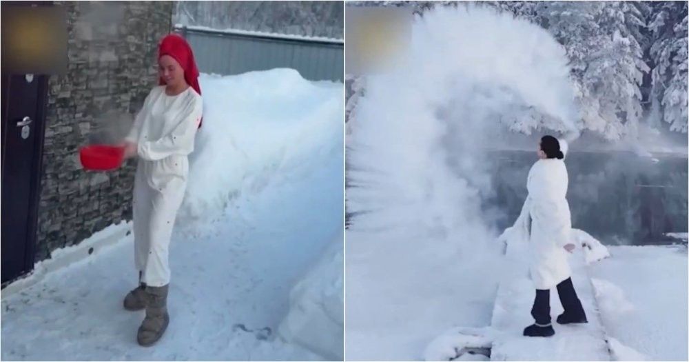Россиянки разбрызгивают кипяток на морозе, пытаясь поймать эффект "снежной дымки", когда вода должна мгновенно испариться и кристаллизоваться в воздухе. Однако из-за недостаточно низкой температуры трюк не срабатывает: горячая вода не замерзает и брызги попадают прямо в лицо, оставляя ожоги.