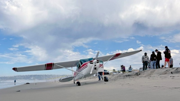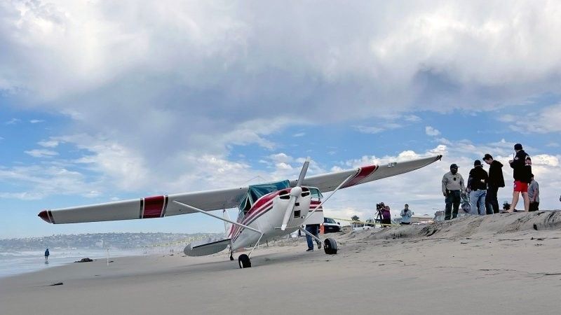 Небольшой самолёт "Сессна" совершил аварийную посадку на пляже Мишн-Бич после отказа двигателя. Пилот с дочерью на борту сумел посадить машину прямо на песок, никого не задев. Очевидцы называют место приземления "идеальным".