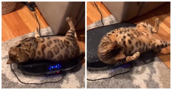 Домашней кошке приглянулась виброплатформа. Теперь у кошки есть массажер для всего тела.
