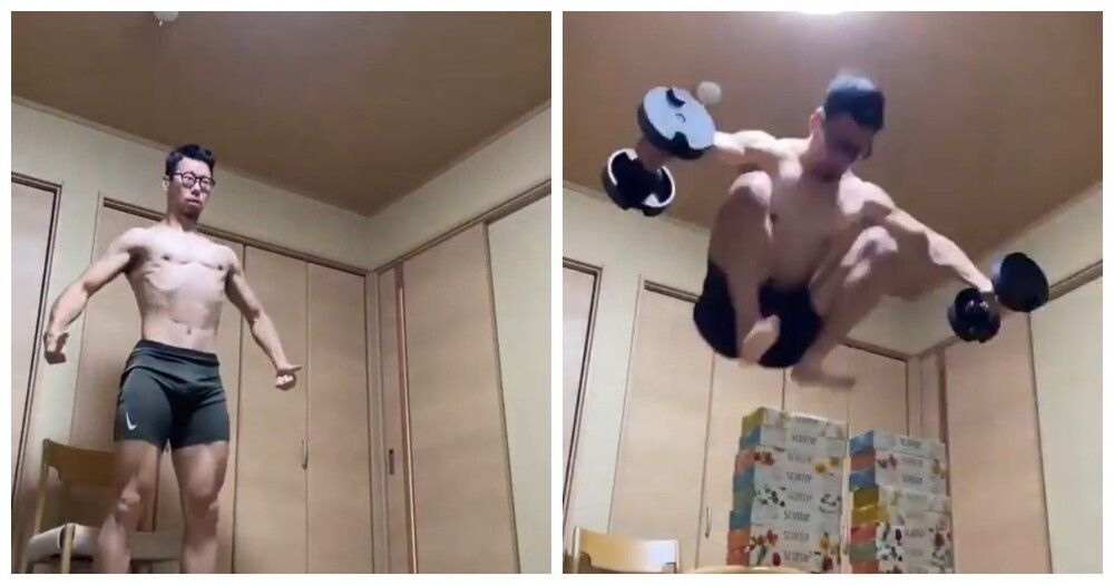 Мужчина выполняет серию прыжков на разные уровни, держа в руках гантели по 8 кг. Такое упражнение развивает силу ног, выносливость и взрывную мощь, одновременно повышая нагрузку на мышцы корпуса и улучшая координацию.