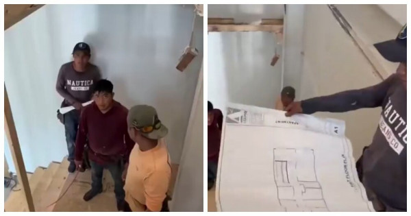 Прораб пришел проверить объект, который доверил бригаде в Техасе и увидел, что строители установили лестницу не в том направлении На претензии начальника один из рабочих из Сальвадора начал перепроверять чертежи дома прямо перед ним.