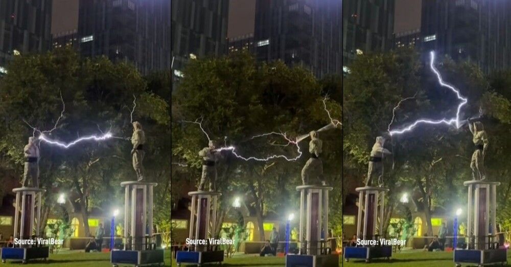 В Китае на фестивале пива в Циндао два танцора, машущие тесла-катушками, передавали между собой электрический ток. В специальных костюмах они превращали высоковольтный ток в световое шоу.