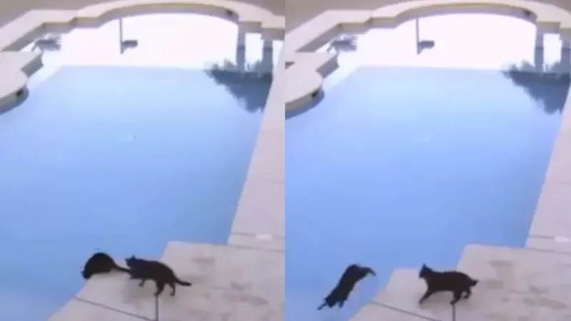 Кот напугал своего соплеменника и вынудил его принять незапланированные водные процедуры.