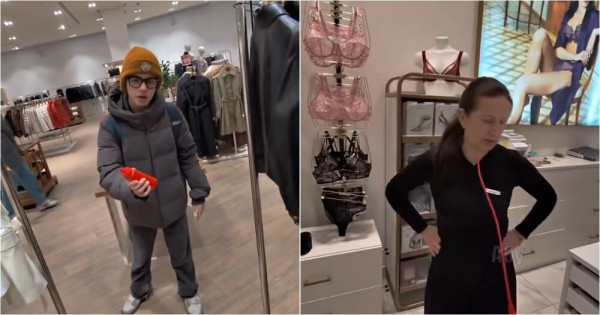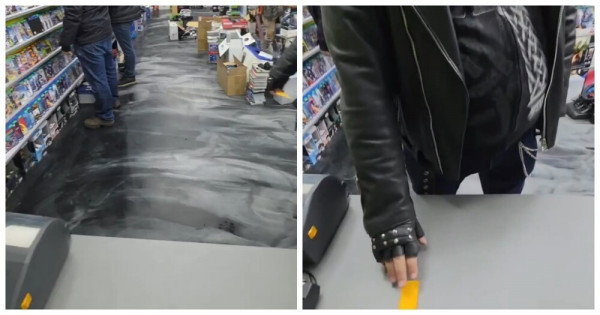 Парень устроил в магазине розыгрыш: направлял кетчуп так, что казалось, будто струя вот-вот обрызгает женщин.