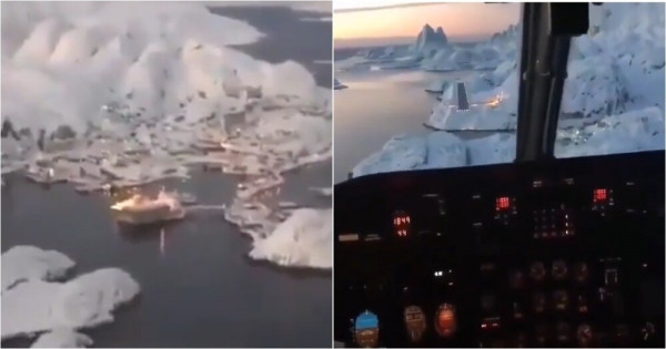 Кадры из кабины пилота показывают, как самолёт выполняет посадку в одном из аэропортов Гренландии, напоминая сцены из далёкой галактики благодаря суровому арктическому пейзажу и уникальному свету.