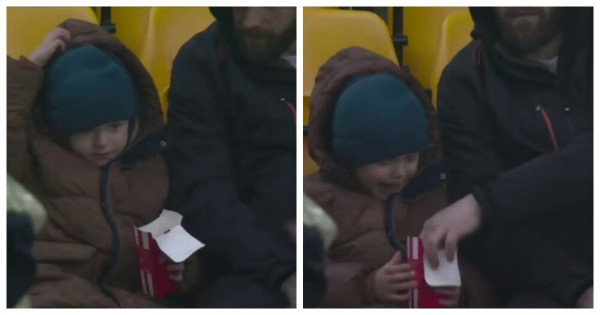 Футбольный болельщик решил попробовать еду, которую ел его сын. Мальчик не был готов к такому поступку отца.